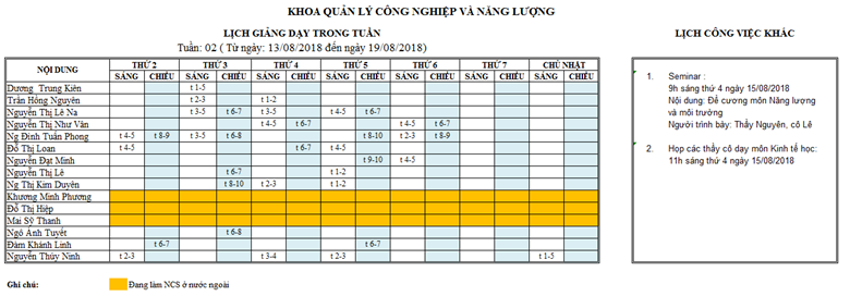 Lịch công tác tuần 02 năm học 2018-2019 Khoa Quản lý Công nghiệp và Năng lượng