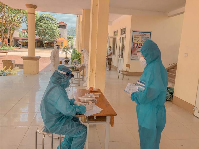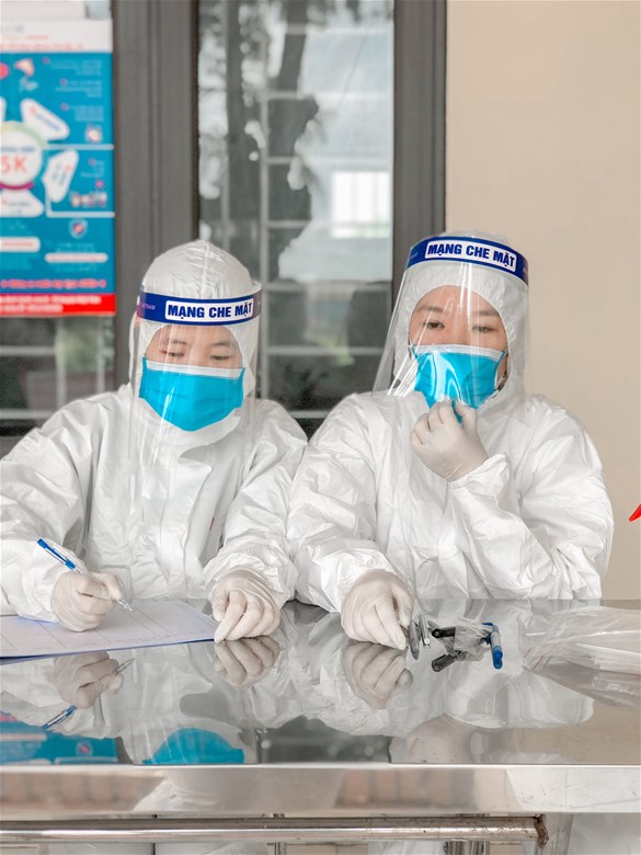 Sinh viên Nguyễn Thị Hải - D13 QLCN, Khoa Quản lý Công nghiệp và Năng lượng tự nguyện tham gia hỗ trợ lấy mẫu xét nghiệm tại khu cách li tập trung Trường Mầm non xã Tự Lạn, Bắc Giang.